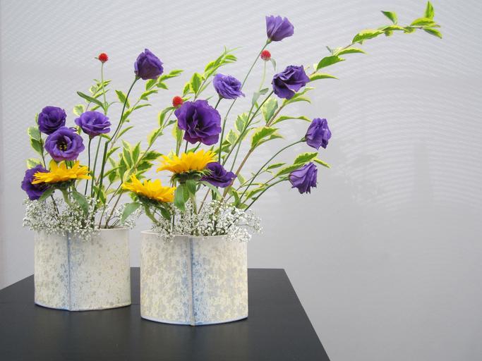 Keywords: floral greeting table decorations ikebana filigree campanula flower purple yellow arrangement bellflower sun flower gypsophila