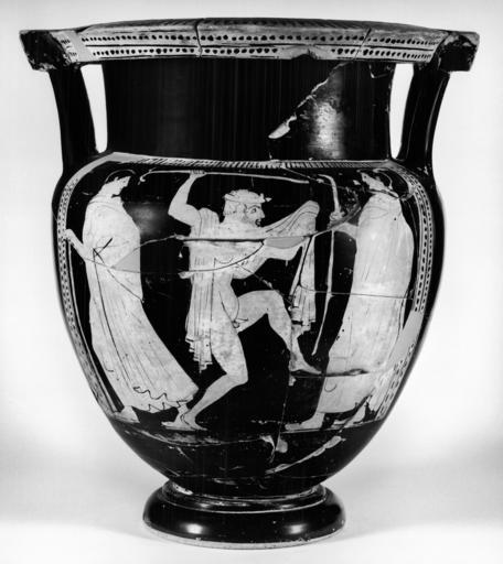 | Keywords: Florence Painter - Column Krater Depicting Symposiasts and a Satyr Dancing with Youths - Walters 4866 - Side B.jpg This red-figure column-krater depicts a symposium with three men on klinai and girl playing auloi On the left a bearded man lies on a kline chest frontal head to the right Only his upper half and half of the kline are shown He has a mantle draped around his left shoulder and waist and wears a thick fillet and wreath He gestures to his fellow banqueters Beneath him a table is visible and above on the wall on the left hangs a basket with covering cloth and on the right a flute case To the right is a girl playing auloi in chiton mantle thick fillet and wreath who stands in profile to the right playing auloi A bearded man and a youth lie on the next kline Both wear mantles thick fillets and wreaths in a fashion similar to the first two figures The man holds a phiale in his right hand and turns his head to the right towards the youth who faces and gestures toward him; a small kylix in black hangs from the right index finger of the youth Beneath them a table and footstool are visible; hanging above from left to right are a basket with covering cloth and a kylix All three support themselves by resting their left elbows on cushions The back depicts an old man dancing and two youths In the center a bearded balding potbellied man advances to the right as if dancing He raises his left foot high off the ground holds a stick in the air above his head in his right hand and extends his left hand out holding a mantle which is wrapped around his back and shoulders He wears a wreath and thick fillet and appears to have a string possibly an amulet around his right forearm On the left a mantled youth goes left looking around a staff in his right hand On the right another mantled youth moves left holding a staff out in his right hand The two youths have fillets ca 460 450 BC Classical terracotta cm 48 2 36 7 h x max diam ; at mout cm 37 4 diam ; at rim cm 18 8 diam accession number 48 66 1243 Don Marcello Massarenti Collection Rome date and mode of acquisition unknown cat no 208 Henry Walters city Baltimore Walters Art Museum Henry Walters Acquired by Henry Walters with the Massarenti Collection 1902 place of origin Attica Greece Walters Art Museum license Ancient Greek red-figure pottery in the Walters Art Museum Florence Painter Media contributed by the Walters Art Museum needs category review Media contributed by the Walters Art Museum needs artist update Dancing satyrs Dance in ancient Greek pottery Satyrs in ancient Greek pottery |