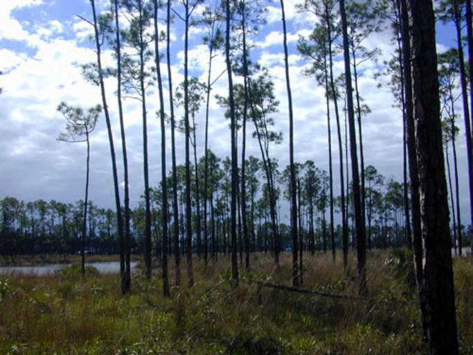 | Keywords: Florida pinelands usgov image.jpg Location from source page southern Florida and appearance identifies these pines as Pinus elliottii var densa From http //sofia usgs gov/virtual_tour/kids/ecosys html Pinelands or pine flatwoods are the most common plant communities in Florida Pinelands are found on nearly level land or on porous limestone Longleaf pine and slash pines are the dominant trees in pinelands Understory plants commonly include saw palmettos wildflowers and ferns Plants that grow in the pinelands must be resistant to fire because pinelands are maintained by fire Fires are beneficial to the pines because young pine seedlings require lots of sunlight to survive and the fires destroy hardwood competitors When fires occur hardwood seedlings and other understory plants are affected but the thick bark of the pine resists fire damage Without fires hardwoods would eventually overshadow the pines and a hardwood hammock would emerge Wildlife commonly found in pinelands includes deer squirrels bobcats skunks opossums raccoons birds snakes and tortoises PD-USGov Pinus elliottii Ecology of Florida Forests in Florida |
