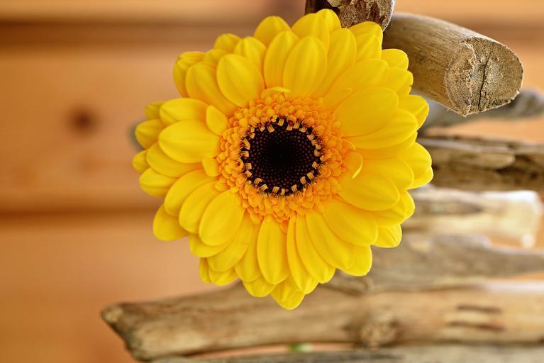 Keywords: flower blossom bloom yellow gerbera schnittblume spring flower wood close deco