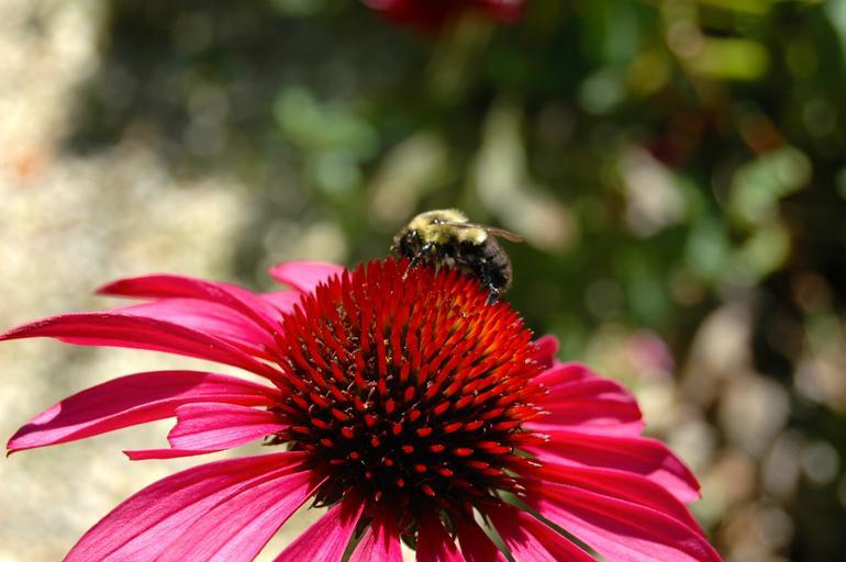 Keywords: flower red pink bumble bee bee floral spring bloom pollen pollinating perennial
