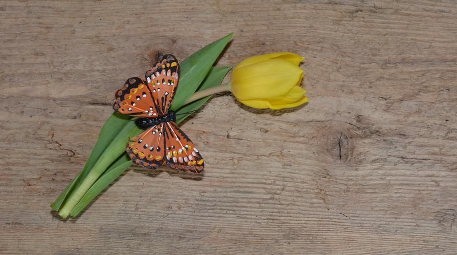 Keywords: flower tulip schnittblume yellow yellow flower deco butterfly wood