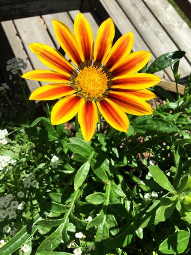 Keywords: flower yellow orange green deck pot grow wood yellow flowers spring nature blossom summer color petal plant bright bloom red garden