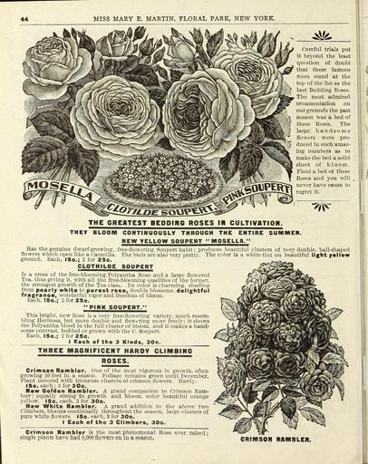 | Keywords: Flowers (16262916838).jpg MISS MARY E MARTIN FLORAL PARK NEW YORK <br> 4 fe <br> Careful trials put <br> it beyond the least <br> question of doubt <br> that these famous <br> roses stand at the <br> top of the list as the <br> best Bedding Roses <br> The most admired <br> ornamentation on <br> our grounds the past <br> season was a bed of <br> these Roses The <br> large handsome <br> flowers were pro- <br> duced in such amaz- <br> ing numbers as to <br> make the bed a solid <br> sheet of bloom <br> Plant a bed of these <br> Roses and you will <br> never have cause to <br> regret it <br> 7AV <br> THE GREATEST BEDDING ROSES IB CULTIVATION <br> THEY BLOOM CONTINUOUSLY THROUGH THE ENTIRE SUMMER <br> NEW YELLOW SOUPERT MOSELLA <br> Has the genuine dwarf-growing free-flowering Soupert habit ; produces beautiful clusters of very double ball-shaped <br> nvers which open like a Camellia The buds are also very pretty The color is a white tint on beautiful light yellow <br> flowers <br> ground Each 15c; 2 for 25c <br> CLOTHILDE SOUPERT <br> Is a cross of the free-blooming Polvantha Rose and a large flowered <br> Tea thus giving it with all the free-blooming qualities of the former <br> the strongest growth of the Tea class Its color is charming shading <br> from pearly white to purest rose double blossoms delightful <br> fragrance wonderful vigor and freedom of bloom <br> Each 15c; 2 for 25c <br> PINK SOUPERT <br> This bright new Rose is a very free-flowering variety much resem- <br> bling Hermosa but more double and flowering more freely; it shows <br> the Polvantha blood in the full cluster of bloom and it makes a hand- <br> some contrast bedded or grown with the C Soupert <br> Each 15c; 2 for 25c <br> __ I Each of the 3 Kinds 30c <br> THREE MAGNIFICENT HARDY CLIMBING <br> ROSES <br> Crimson Rambler One of the most vigorous in growth often <br> growing 10 feet in a season Foliage remains green until December <br> Plant covered with immense clusters of crimson flowers Hardv <br> 15c each ; 3 for 3 0c <br> New Golden Rambler A grand companion to Crimson Ram- <br> bier ; equally strong in growth and bloom color beautiful orange <br> yellow 15c each 3 for 30c <br> New White Rambler A grand addition to the above two <br> Climbers blooms continually throughout the season large clusters of <br> pure white flowers 15c each 3 for 30c <br> I Each of the 3 Climbers 3Qc <br> Crimson Rambler is the most phenomenal Rose ever raised; <br> gingle plants have had 6 000 flowers on in a season <br> CRIMSON RAMSLER 43800651 148987 77812 Page 46 Text http //www biodiversitylibrary org/page/43800651 1900 Henry G Gilbert Nursery and Seed Trade Catalog Collection ; Miss Mary E Martin Firm ; Miss Mary E Martin Firm NameFound Hermosa NameConfirmed Hermosa NameBankID 4192544 Biodiversity Heritage Library Flowers Christmas Easter midwinter and spring Garden Stories Catalogs Flowers Miss Mary E Martin Firm Nurseries Horticulture Seeds U S Department of Agriculture National Agricultural Library bhl page 43800651 dc identifier http //biodiversitylibrary org/page/43800651 bhlGardenStories Crimson Rambler Rose Mosella Pink Soupert Clotilde Soupert Bedding Roses BHLinbloom miss mary e martin firm nurseries horticulture u s department of agriculture national agricultural library bhlgardenstories crimson rambler rose pink soupert clotilde soupert bedding roses bhlinbloom Information field Flickr posted date ISOdate 2015-02-05 CC-BY-2 0 BioDivLibrary https //flickr com/photos/61021753 N02/16262916838 2015-08-25 00 51 15 cc-by-2 0 PD-old-70-1923 Miss Mary E Martin Firm seed catalog Photos uploaded from Flickr by Fæ using a script |