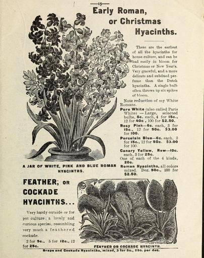 | Keywords: Flowers (16264638457).jpg Early Roman <br> or Christmas <br> Hyacinths <br> A JAR OF WHITE PINK AND BLUE ROMAN <br> HYACINTHS <br> These are the earliest <br> of all the hyacinths for <br> house culture and can be <br> had easily in bloom for <br> Christmas or New Year's <br> Very graceful and a more <br> delicate and subdued per- <br> fume than the Dutch <br> hyacinths A single bulb <br> often throws up six spikes <br> of bloom <br> Note reduction of my White <br> Komans <br> Pure White also called Paris <br> White ” Large selected <br> bulbs 5c each 4 for I5e t <br> 12 for 40c 100 for 2 50 <br> Rosy Pink ” 6c each 3 for <br> 15c 12 for 50o 3 00 <br> for 100 <br> Porcelain Blue ” 6c each 3 <br> for 15c 12 for 50c 3 00 <br> for 100 <br> Canary Yellow New ” 10c <br> each 3 for 25c <br> One of each of the 4 kinds <br> 20o <br> Roman Hyacinths all colors <br> mixed Doz 50c 100 for <br> 2 50 <br> FEATHER or <br> COCKADE <br> HYACINTHS <br> Very hardy outside or for <br> pot culture ; a lovely and <br> curious species resembling <br> very much a feathered <br> cockade <br> 2 for 5c 5 for 12c 12 <br> for 25c <br> FEATHER OR COCKADE HYACINTH <br> id Coofcad Hyaoinfchft mixed 3 for 5© 25c per do 43800620 148987 77812 Page 15 Text http //www biodiversitylibrary org/page/43800620 1900 Henry G Gilbert Nursery and Seed Trade Catalog Collection ; Miss Mary E Martin Firm ; Miss Mary E Martin Firm Biodiversity Heritage Library Flowers Christmas Easter midwinter and spring Garden Stories Catalogs Flowers Miss Mary E Martin Firm Nurseries Horticulture Seeds U S Department of Agriculture National Agricultural Library bhl page 43800620 dc identifier http //biodiversitylibrary org/page/43800620 bhlGardenStories Hyacinths Bulbs Plants BHLinbloom miss mary e martin firm nurseries horticulture u s department of agriculture national agricultural library bhlgardenstories bulbs plants bhlinbloom Information field Flickr posted date ISOdate 2015-02-05 CC-BY-2 0 BioDivLibrary https //flickr com/photos/61021753 N02/16264638457 2015-08-25 00 54 59 cc-by-2 0 PD-old-70-1923 Miss Mary E Martin Firm seed catalog Photos uploaded from Flickr by Fæ using a script |