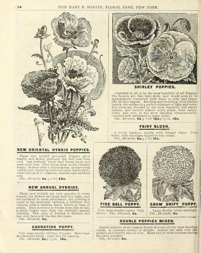 | Keywords: Flowers for springtime (15882985333).jpg 34 <br> MISS MARY E MARTIN FLORAL PARK NEW YORK <br> HEW ORIENTAL HYBRID POPPIES <br> These new hybrid perennial Poppies grow <br> readily and flower profusely the first year from <br> seed Are perfectly hardy and bloom more and <br> more each year They are as large as the Oriental <br> Poppy ; flowers often 6 inches across in marvelous <br> variety and charming shades of color tender flesh <br> white and pink to crimsons scarlets and ox-blood <br> reds <br> Pkt 100 seeds 8c; 4 for 25c <br> NEW ANNUAL HYBRIDS <br> These new hybrids are very superior in even- <br> respect the flowers are single and very large and <br> are produced in great abundance the coloring is <br> equal to the perennial varieties a brilliant rich <br> crimson with a lustrous black blotch at base of <br> petals They continue in bloom from July to fall <br> a much longer time than the ordinary annual <br> varieties This class of Poppies is distinct and <br> has onlv been sold the last two years <br> Pkt 100 seeds 8c <br> CARNATION POPPY <br> Yery large double brilliant Poppies More than <br> 50 colors and kinds ; extra fine for massing <br> Pkt 200 seeds 3c; Koz IQc <br> SHIRLEY POPPIES <br> Conceded by all to be the most beautiful of all Poppies <br> The flowers are like fairy-work and would seem to be <br> appropriately connected with them so silky and tissue- <br> like do they appear Bending and trembling with lifelike <br> beauty the surface is a perfect shimmer of iight and color <br> The colors are blended in the most beautiful and showy <br> fashion and include almost every shade from satiny- <br> white pale rose to the most dazzling crimson-scarlet <br> blotched and variegated in manv stvles <br> Pkt 200 seeds 4c 3 for JOc; oz SOc <br> FAIRY BL USH <br> A lovely feathery double with fringed edges Pure <br> white with the edges dipped in rosv cream <br> Pkt 200 seeds 4c; 3 for flOc <br> FIRE BALL POPPY <br> Yery large double scarlet Yerv <br> showy Pkt 200 seeds 3c <br> H'V <br> SNOW DRIFT POPPY <br> Large double white snowball <br> Pkt 200 seeds 3c <br> DOUBLE POPPIES MIXED <br> Superb mixture of the largest double flowers ” of the most dazzling <br> colors A constant source of delight Scatter the seed over the I <br> ground and slightly rake it over Make two or three sowings during <br> the earlv summer <br> - Pkt 300 seeds 4c 43810174 149144 77948 Page 34 Text http //www biodiversitylibrary org/page/43810174 1900 Henry G Gilbert Nursery and Seed Trade Catalog Collection ; Miss Mary E Martin Firm ; Miss Mary E Martin Firm Biodiversity Heritage Library Flowers for springtime Garden Stories Catalogs Flowers Miss Mary E Martin Firm Nurseries Horticulture Seeds U S Department of Agriculture National Agricultural Library bhl page 43810174 dc identifier http //biodiversitylibrary org/page/43810174 bhlGardenStories Poppies BHLinbloom miss mary e martin firm nurseries horticulture u s department of agriculture national agricultural library bhlgardenstories bhlinbloom Information field Flickr posted date ISOdate 2015-02-11 CC-BY-2 0 BioDivLibrary https //flickr com/photos/61021753 N02/15882985333 2015-08-24 23 56 46 cc-by-2 0 PD-old-70-1923 Flowers for springtime Photos uploaded from Flickr by Fæ using a script |