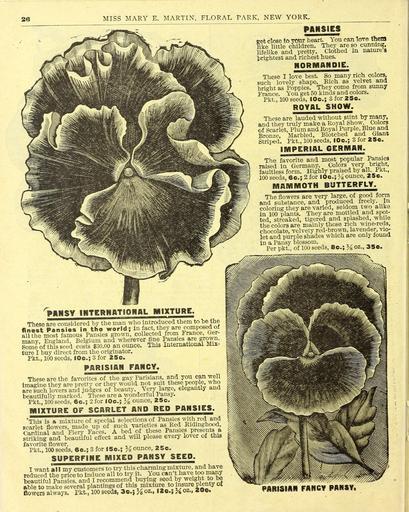 | Keywords: Flowers for springtime (16477124646).jpg MARTIN FLORAL PARK NEW YORK <br> PANSIES <br> get close to your heart You can lore then <br> like little children They are so cunning <br> lifelike and pretty Clothed in natures <br> brightest and richest hues <br> NORMANP1E <br> These I lore best So many rich colors <br> such lovely shape Rich as velvet and <br> bright as Poppies They come from sunny <br> France You get 50 kinds and colors <br> Pkt 100 seeds IOc; 3 for 25c <br> ROYAL SHOW <br> These are lauded without stint by many <br> and thev truly make a Royal Show Colors <br> of Scarlet Plum and Royal Purple Blue and <br> Bronze Marbled Blotched and Giant <br> Striped Pkt 100 seeds IOc; 3 for 25c <br> IMPERIAL GERMAN <br> The favorite and most popular Pansies <br> raised in Germany Colors very bright <br> faultless form Highly praised by all Pkt <br> lOOseeds 6c;2for IOc; gOunce 25c <br> MAMMOTH BUTTERFLY <br> The flowers are very large of good form <br> and substance and produced freely In <br> coloring they are varied seldom two alike <br> in 100 plants They are mottled and spot- <br> ted streaked tigered and splashed while <br> the colors are mainly those rich wine-reds <br> chocolate velvety red-brown lavender vio- <br> let and purple shades which are only found <br> in a Pansy blossom <br> Per pkt of 100 seeds 8c; oz 35c <br> PANSY INTERNATIONAL MIXTURE <br> These are considered by the man who introduced them to be the <br> finest Pansies in the world ; in fact they are composed of <br> TlUhe molt famJus Pansies grown collected from France Ger- <br> many England Belgium and wherever fine tansies are grown <br> Some of this seed costs 30 00 an ounce This International Mix- <br> ture I buy direct from the originator <br> Pkt 100 seeds IOc; 3 for 25c <br> PARISIAN FANCY <br> These are the favorites of the gay Parisians and you can well <br> imagine they are pretty or they would not suit these people who <br> are luch lovers and judges of beauty Very large elegantly and <br> beautifullv marked These are a wonderful Pansy <br> Pkt 100 seeds 6c; 2 for IOc; V ounce 25c <br> MIXTURE OF SCARLET AND REP PANSIES <br> 'This is a mixture of special selections of Pansies with red I and <br> scarlet flowers made up of such varieties as Red Ridmghood <br> rardinal and Fierv Faces A bed of these Pansies presents a <br> striking and lS ul effect and will please every lover of this <br> favorite flower _ _ <br> Pkt 100 seeds 6c; 3 for 15c; jounce 25c <br> SUPERFINE MIXED PANSY SEEP <br> I want all my customers to try this charming mixture and have <br> reduced the price to induce all to try it You can't have too many <br> beautiful Pansies and I recommend buying seed by weight to be <br> able to make several planting of this mixture to insure plenty of <br> flowers always Pkt 100 seeds 3c; oz 12c; K oz 20c <br> PARISIAN FANCY PANSY 43810166 149144 77948 Page 26 Text http //www biodiversitylibrary org/page/43810166 1900 Henry G Gilbert Nursery and Seed Trade Catalog Collection ; Miss Mary E Martin Firm ; Miss Mary E Martin Firm Biodiversity Heritage Library Flowers for springtime Garden Stories Catalogs Flowers Miss Mary E Martin Firm Nurseries Horticulture Seeds U S Department of Agriculture National Agricultural Library bhl page 43810166 dc identifier http //biodiversitylibrary org/page/43810166 bhlGardenStories Pansy BHLinbloom miss mary e martin firm nurseries horticulture u s department of agriculture national agricultural library bhlgardenstories bhlinbloom Information field Flickr posted date ISOdate 2015-02-11 CC-BY-2 0 BioDivLibrary https //flickr com/photos/61021753 N02/16477124646 2015-08-24 23 51 51 cc-by-2 0 PD-old-70-1923 Flowers for springtime Photos uploaded from Flickr by Fæ using a script |