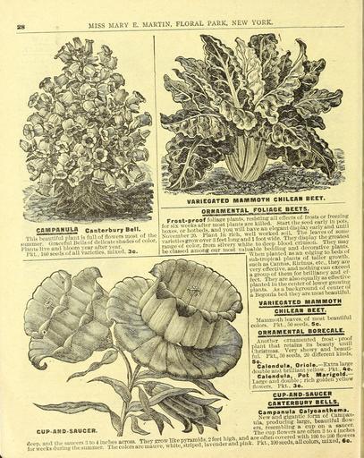 Keywords: Flowers for springtime (16477127126).jpg MISS MARY £ MARTIN FLORAL PARK NEW YORK <br> CAM PANULA Canterbury Bell <br> Tki „¢utlful plant is full of flowers most of the <br> siinimei -Graceful Bells of delicate shades of color <br> Plants live and bloom year after year <br> Pkt 160 seeds of all varieties mixed 3c <br> VARIEGATED MAMMOTH CHILEAN BEET <br> ORNAMENTAL FOLlAOE_BJEETS <br> sub-tropical plants of taller growth <br> such as Cannas Ricinus etc they are <br> verv effective and nothing can exceed <br> a group of them for brilliancy and ef- <br> fect They are also equally as efieetn e <br> planted in the center of lower growing <br> plants As a background of center ot <br> a Begonia bed they are most beautiful <br> VARIEGATED MAMMOTH <br> CHILEAN BEET <br> Mammoth leaves of most beautiful <br> colors Pkt 50 seeds 5c <br> ORNAMENTAL BORECALE <br> \nother ornamented frost - proof <br> plant that retains its beauty until <br> Christmas Very showy and beauti- <br> ful Pkt 50 seeds 20 different kinds <br> 5 Calendula Oriole -Extra large <br> double and brilliant yellow Pkt 4c <br> Calendula Pot Marigold ” <br> Large and double ; rich golden yellow <br> i fl owers Pkt 3c <br> CUP-AND-SAUCER <br> CANTERBURY BELLS <br> Campanula Calycanthema <br> New and gigantic form of Campan- <br> ula producing large beautiful flow- <br> ers resembling a cup on a saucer <br> bwr-n»»-»»w W vj» - s s j ” w The cup flowers are often 3 to 4 incnes <br> fle e P an tne sauce 3 to 4 note 1 <br> for weeks during the summer The colors are mam e w mte suiptu <br> CUP-AMD-SAUCER 43810168 149144 77948 Page 28 Text http //www biodiversitylibrary org/page/43810168 1900 Henry G Gilbert Nursery and Seed Trade Catalog Collection ; Miss Mary E Martin Firm ; Miss Mary E Martin Firm Biodiversity Heritage Library Flowers for springtime Garden Stories Catalogs Flowers Miss Mary E Martin Firm Nurseries Horticulture Seeds U S Department of Agriculture National Agricultural Library bhl page 43810168 dc identifier http //biodiversitylibrary org/page/43810168 bhlGardenStories Ornamental Beets Cup and Saucer BHLinbloom miss mary e martin firm nurseries horticulture u s department of agriculture national agricultural library bhlgardenstories ornamental beets cup and saucer bhlinbloom Information field Flickr posted date ISOdate 2015-02-11 CC-BY-2 0 BioDivLibrary https //flickr com/photos/61021753 N02/16477127126 2015-08-24 23 51 53 cc-by-2 0 PD-old-70-1923 Flowers for springtime Photos uploaded from Flickr by Fæ using a script |
