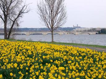 Keywords: flowers yellow daffodils floral mass planting park river fresh blooming blossoms petals spring nature plants