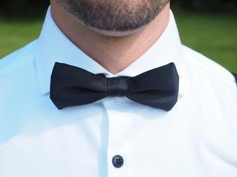 Keywords: fly suit groom loop collar clothing accessory chic noble elegant festive black tuxedo man lapel shirt detail section shirt button