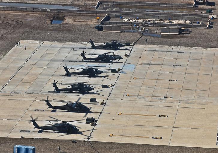 | Keywords: Flying with Combat Aviation Brigade, 4th Infantry Division DVIDS126912.jpg en Two Black Hawk helicopters and four Apache attack helicopters from the Combat Aviation Brigade 4th Infantry Division Multi-National Division - Baghdad fuel up at the brigade's Forward Arming and Refueling point during the start of a mission at Camp Taji Nov 5 2008 To date the refueling point at Camp Taji has distributed more than 1 6 million gallons of fuel to coalition aircraft operating in MND-B 2008-11-05 Spc Jason Dangel https //www dvidshub net/image/126912 126912 2008-11-07 09 49 CAMP TAJI IQ PD-USGov Camp Taji Images from DoD uploaded by Fæ |