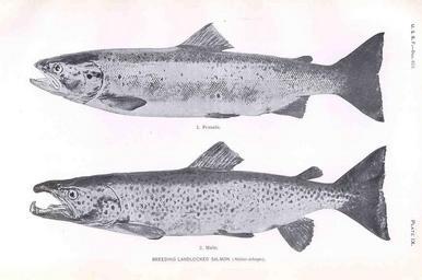 Keywords: FMIB 33507 Breeding Landlocked Salmon (Salmo sebago).jpeg Breeding Landlocked Salmon Salmo sebago Female 1 ;; Male 2 Subject Salmon Tag Fish 1906-1907 Cite book Fishes of the Connecticut lakes and neighboring waters with notes on the plankton environment Kendall William Converse b Washington DC Government Printing Office 1909 Report of the Commissioner of Fisheries 1906-1907 Plate IX Creator William Converse Kendall PD-UWASH-FMIB Institution University of Washington FMIB-source accession number 33507 Images from the Freshwater and Marine Image Bank to check Drawings of fish by William Converse Kendall Black and white photos of salmon Salmo salar |