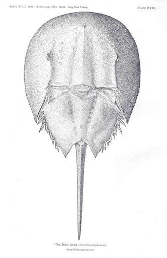 | Keywords: FMIB 34156 King Crab (Limulus polyphemus).jpeg King Crab Limulus polyphemus Four-fifths natural size Subject Limulus polyphemus Crabs Tag Shellfish 1889 Cite book Notes on the king-crab fishery of Delaware Bay Smith Hugh M Washington DC Government Printing Office 1891 Bulletin of the United States Fish Commission vol 9 1889 Plate CXXI Creator Hugh McCormick Smith PD-UWASH-FMIB Institution University of Washington FMIB-source accession number 34156 Hugh McCormick Smith Limulus polyphemus Drawings of Crustacea |