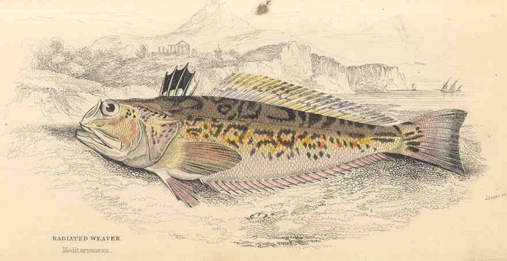 Keywords: FMIB 35945 Radiated Weaver.jpeg check categories 17 August 2015 3 Radiated Weaver Mediterranean Subject Weevers Tag Fish 1843 Cite book Fishes Particularly Their Structure and Economical Uses Bushnan John Stevenson London England Chatto and Windus 1843 Naturalist's Library v 35 Ichthyology vol 1 Facing page 144 Creator John Stevenson Bushnan PD-UWASH-FMIB Institution University of Washington FMIB-source accession number 35945 Images from the Freshwater and Marine Image Bank to check John Stevenson Bushnan Trachinoidei Mediterranean |