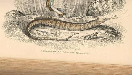Keywords: FMIB 36386 AEquorial pipe fish (1); Short Nosed Hippocampus (2).jpeg check categories 18 August 2015 2 AEquorial pipe fish 1 ; Short Nosed Hippocampus 2 Subject Sea horses Aecestra Tag Fish 1866 Cite book British Fishes Part II Hamilton Robert London England Chatto and Windus 1866 Naturalist's Library vol 37 Facing page 278 Creator Robert Hamilton PD-UWASH-FMIB Institution University of Washington FMIB-source accession number 36386 Images from the Freshwater and Marine Image Bank to check Robert Hamilton Syngnathidae |