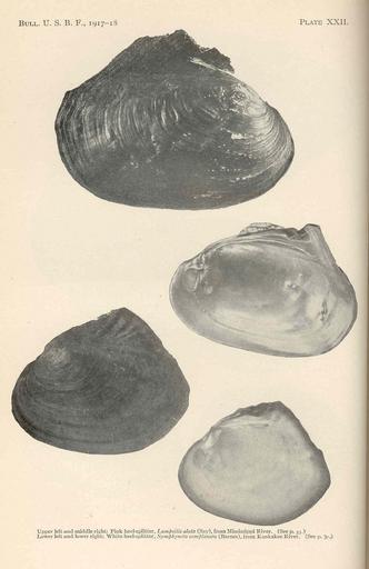 | Keywords: FMIB 38256 Pink heel-splitter, Lampsilis alata (Say), from Mississippi River, Upper left and middle right; White heel-splitter, Symphynota.jpeg check categories 26 August 2015 4 Pink heel-splitter Lampsilis alata Say from Mississippi River Upper left and middle right; White heel-splitter Symphynota complanata Barnes from Kankakee River lower left and lower right Subject Lampsilis Symphynota Freshwater mussels Tag Shellfish 1921 Cite book Fresh-water Mussels and Mussel Industries of the United States Coker Robert E Washington DC Government Printing Office 1921 Bulletin of the United States Bureau of Fisheries vol 36 1917-1918 Plate XXII Creator Robert Ervin Coker PD-UWASH-FMIB Institution University of Washington FMIB-source accession number 38256 Images from the Freshwater and Marine Image Bank to check Robert Ervin Coker Lampsilis Potamilus Shellfish |