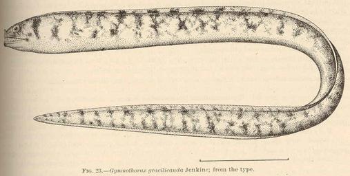 | Keywords: FMIB 42384 Gymnopthorax gracilicauda Jenkins; from the type.jpeg Gymnopthorax gracilicauda Jenkins; from the type Subject Morays Gymnothorax Tag Fish 1905 Cite book Shore Fishes of the Hawaiian Islands With a General Account of the Fish Fauna Jordan David Starr; Evermann Barton Warren Washington DC Government Printing Office 1905 Bulletin of the United States Fish Commission vol 23 for 1903 part I Fig 23 Creator David Starr Jordan Creator Barton Warren Evermann PD-UWASH-FMIB Institution University of Washington FMIB-source accession number 42384 Images from the Freshwater and Marine Image Bank to check David Starr Jordan Barton Warren Evermann Gymnothorax gracilicauda |