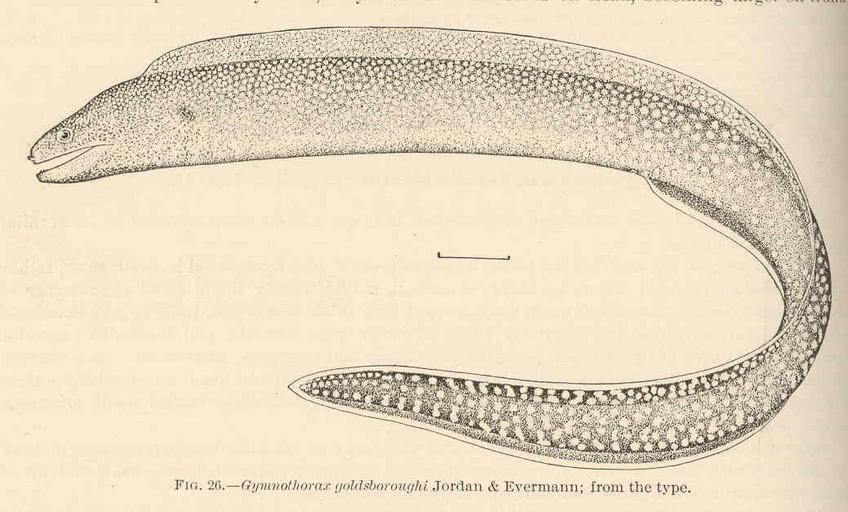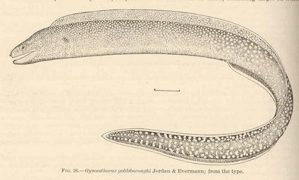 | Keywords: FMIB 42391 Gymnothorax goldsboroughi Jordan & Evermann; from the type.jpeg Gymnothorax goldsboroughi Jordan Evermann; from the type Subject Morays Gymnothorax Tag Fish 1905 Cite book Shore Fishes of the Hawaiian Islands With a General Account of the Fish Fauna Jordan David Starr; Evermann Barton Warren Washington DC Government Printing Office 1905 Bulletin of the United States Fish Commission vol 23 for 1903 part I Fig 26 Creator David Starr Jordan Creator Barton Warren Evermann PD-UWASH-FMIB Institution University of Washington FMIB-source accession number 42391 Images from the Freshwater and Marine Image Bank to check David Starr Jordan Barton Warren Evermann Gymnothorax elegans |