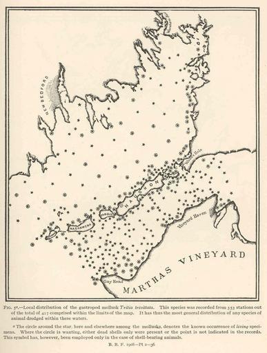 Keywords: FMIB 47539 Local distribution of the gastropod mollusk Tritia trivittata This species was recorded from 353 stations out of the total of.jpeg check categories 14 September 2015 2 Local distribution of the gastropod mollusk Tritia trivittata This species was recorded from 353 stations out of the total of 417 comprised within the limits of the map It has thus the most general distribution of any species of animal dredged within these waters The circle around the star here and elsewhere among the mollusks denotes the known occurrence of living specimens Where the circle is wanting either dead shells only were present or the point is not indicated in the records The symbol has however been employed only in the case of shell-bearing animals Subject Mollusks--Geographical Distribution Tritia--Geographical Distribution Vineyard Sound Massachusetts --Maps Buzzards Bay Maqssachusetts Bay --Maps Geographic Subject United States--Massachusetts--Vineyard Sound United States--Massachussetts--Buzzards Bay Tag Mollusks 1910 00 Cite book Intensive Study of the Fauna and Flora of a Restricted Area of Sea Bottom Sumner Francis B Washington DC Government Printing Office 1910 Bulletin of the Bureau of Fisheries vol 28 1908 Part 2 Fig 5 Creator Francis Bertody Sumner PD-UWASH-FMIB Institution University of Washington FMIB-source accession number 47539 Images from the Freshwater and Marine Image Bank to check Francis Bertody Sumner Mollusca |