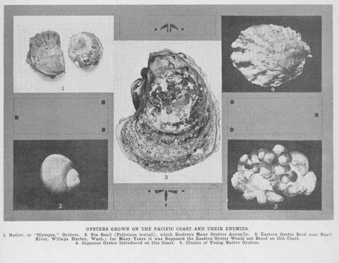 | Keywords: FMIB 47625 Oysters Grown on the Pacific Coast and Their Enemies -.jpeg  check categories 19 August 2015 5 Oysters Grown on the Pacific Coast and Their Enemies 1 Native or 'Olympia' Oysters 2 Sea Snail Polynices lewisii which destroys many oysters annually 3 Eastern Oyster Bred near Nasel River Willapa Harbor Wash for many years it was supposed the Eastern Oyster would not breed on this coast 4 Japanese oyster introduced on this coast 5 Cluster of young native oysters Subject Oysters Olympia oyster Polynices American oyster Crassostrea gigas Tag Shellfish 1916 00 Cite book Oysters Grown on the Pacific Coast and Their Enemies 1 Native or 'Olympia' Oysters 2 Sea Snail Polynices lewisii which destroys many oysters annually 3 Eastern Oyster Bred near Nasel River Willapa Harbor Wash for many years it was supposed the Eastern Oyster would not breed on this coast 4 Japanese oyster introduced on this coast 5 Cluster of young native oysters Seattle WA 1916 Pacific Fisherman Year Book 1916 69 author PD-UWASH-FMIB Institution University of Washington FMIB-source accession number 47625 Images from the Freshwater and Marine Image Bank to check Oysters Ostrea lurida Polinices Crassostrea gigas |