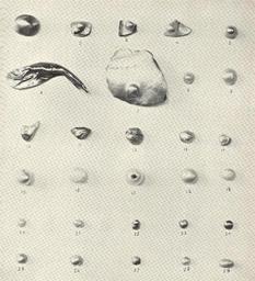 Keywords: FMIB 47849 Encysted Pearls and Pearls with Marked Interiors.jpeg check categories 21 August 2015 3 Encysted Pearls and Pearls with Marked Interiors 1-Pearly lump from shell of unio 2-5 7-9 13-Encysted or ingrown pearls 6- Small crayfish completely encysted Nos 10-12 14-16 18-21 23-29- Pearls formed over some foreign matter deffering in color from the nacre No 17-Hollow bead-like pearl from which the nucleus has entirely disappeared--perhaps some insect or bit of vegetable matter that has decayed or piece of clay that has disintegrated and washed out It can now be blown through like a whilstle No 22-Double or notched pearl the result of the joining and intergrowth of two pearls Subject Pearls Tag Shellfish 1898 00 Cite book Fresh-Water Pearls and Pearl Fisheries of the United States Kunz George F Washington DC Government Printing Office 1898 Bulletin of the United States Fish Commission vol 17 1897 Plate XI Creator George Frederick Kunz PD-UWASH-FMIB Institution University of Washington FMIB-source accession number 47849 Images from the Freshwater and Marine Image Bank to check George Frederick Kunz Pearls Oysters |