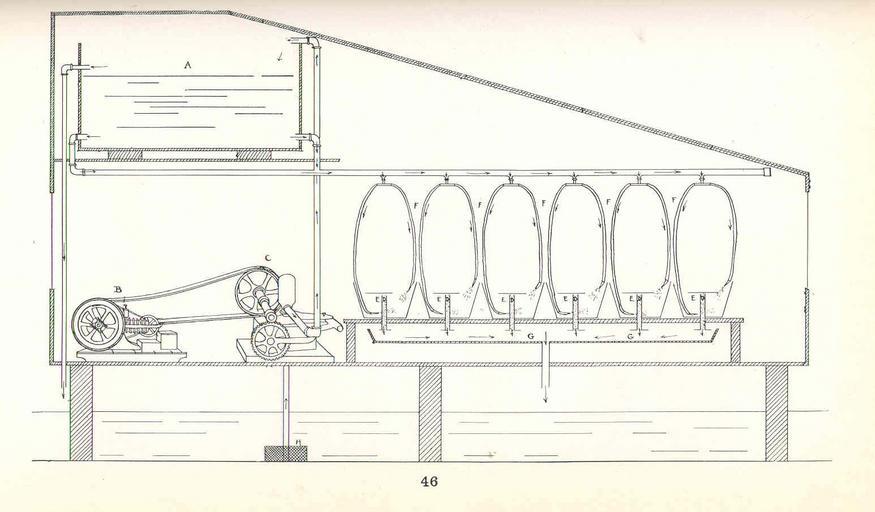 | Keywords: FMIB 48200 Diagram of the method used in experimental hatching of quahaug eggs and rearing of the young larvae at the Wellfleet laboratory.jpeg check categories 17 September 2015 2 Diagram of the method used in experimental hatching of quahaug eggs and rearing of the young larvae at the Wellfleet laboratory It represents a cross-section of the laboratory showing a small 1 1/2 horse power gasoline engine B connected by a belt with a pump C by which salt water is forced from below into a tank A situated near the roof The laboratory is located on a wharf over the water which enables salt water to be obtained directly from beneath the floor The inlet of the pump is guarded by a strainer H which prevents seaweed entering the pipe From the tank the salt water is conducted through the laboratory by a large pipe set with small petcocks From these petcocks pieces of rubber tubing F lead to the hatching tubs E which consist of half barrels fitted with sand filters D The tubs are placed over a sink G which carries off the filtered water By this arrangement a continuous flow of water is established through the hatching tanks Subject Shellfish culture--Massachusetts Laboratories--Wellfleet Massachusetts Tag Shellfish 1912 Cite book Report Upon the Quahaug and Oyster Fisheries of Massachusetts Massachusetts Commissioners on Fisheries and Game Boston MA Wright Potter Printing Co 1912 Fig 46 State of Massachusetts Fish and Game Commission PD-UWASH-FMIB Institution University of Washington FMIB-source accession number 48200 Images from the Freshwater and Marine Image Bank to check State of Massachusetts Fish and Game Commission Shellfish |