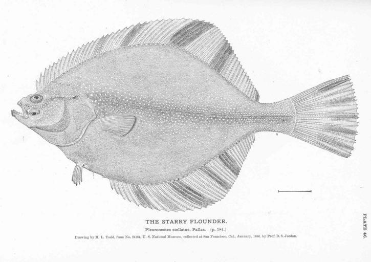 | Keywords: FMIB 50883 Starry Flounder.jpeg check categories 7 September 2015 2 Starry Flounder Pleuronectes stellatus Pallas Subject Starry flounder Tag Fish 1884 Cite book Fisheries and Fishery Industries of the United States Section I Natural History of Useful Aquatic Animals Plates Goode George Brown Washington DC Government Printing Office 1884 Plate 46 Creator H L Todd PD-UWASH-FMIB Institution University of Washington FMIB-source accession number 50883 Images from the Freshwater and Marine Image Bank to check H L Todd Platichthys stellatus |