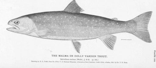 Keywords: FMIB 51079 Malma or Dolly Varden Trout.jpeg Malma or Dolly Varden Trout Salvelinus malma Walb J G Subject Dolly Varden Fish Tag Fish 1884 Cite book Fisheries and Fishery Industries of the United States Section I Natural History of Useful Aquatic Animals Plates Goode George Brown Washington DC Government Printing Office 1884 Plate 193 Creator George Brown Goode PD-UWASH-FMIB Institution University of Washington FMIB-source accession number 51079 Images from the Freshwater and Marine Image Bank to check The Fisheries and Fishery Industries of the United States Salvelinus malma