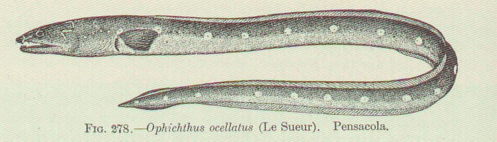 | Keywords: FMIB 51815 Ophiuchthus ocellatus (Le Sueur) Pensacola.jpeg Ophiuchthus ocellatus Le Sueur Pensacola Subject Eels Tag Fish 1907 Cite book Fishes Jordan David Starr New York City NY Henry Holt and Company 1907 Fig 278 Creator David Starr Jordan PD-UWASH-FMIB Institution University of Washington FMIB-source accession number 51815 Images from the Freshwater and Marine Image Bank to check David Starr Jordan Myrichthys ocellatus | ||||