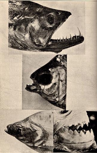 | Keywords: FMIB 52291 Adaptive Radiation in the Characinide The central figure of Atygnax bimaculatus with notched teeth probably represents the more.jpeg Adaptive Radiation in the Characinide The central figure of Atygnax bimaculatus with notched teeth probably represents the more primitive condition The lower lefthand figure represents Anodus latior with no teeth and a very long alimentary canal a mud eater The lower right-hand figure represents the scissor-like jaw and teeth of Serrasaima humeralis whose relatives have been repeatedly reported to have killed bathers before they could reach shore after being attacked The upper figure represents Raphiodon vulpinus Spix which has reached the extreme in conical teeth the large canines protruding above when the jaws are closed The over 100 South American genera and 500 species of this family offer pretty complete series from the center to the txtremes with many lateral branches Subject Characidae Tag Fish 1906 Cite book Fresh-Water Fishes of North and Middle America Eigenmann Carl H Popular Science Monthly June 1906 524 Creator Carl H Eigenmann PD-UWASH-FMIB Institution University of Washington FMIB-source accession number 52291 Images from the Freshwater and Marine Image Bank to check Carl Eigenmann Astyanax bimaculatus |
