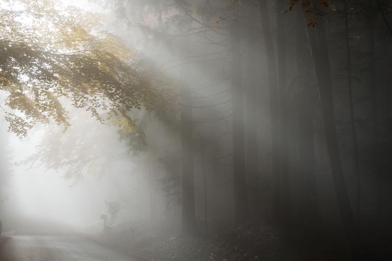 Keywords: fog autumn light nature landscape forest tree mood atmosphere styria golden autumn rest fresh time of year fall leaves orange red gold coloring bright leaves fall color october golden fall foliage leaves in the autumn