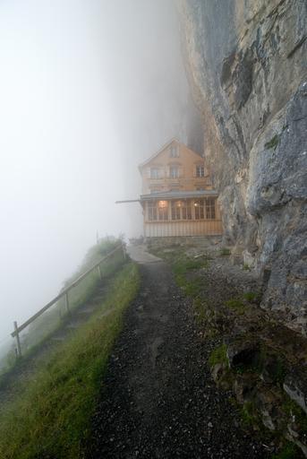 Keywords: fog hut house rocks mountain nature misty rural wooden scenery building hiking outdoors europe mountains