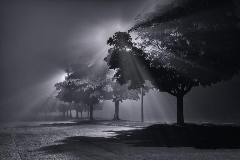 Keywords: fog light beams natural bright foggy misty magic mystery tree dark