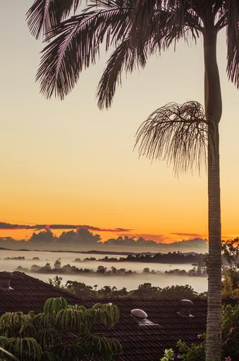 Keywords: fog sunrise palm trees nature landscape morning mist sky dawn sunset foggy outdoor orange rural environment calm