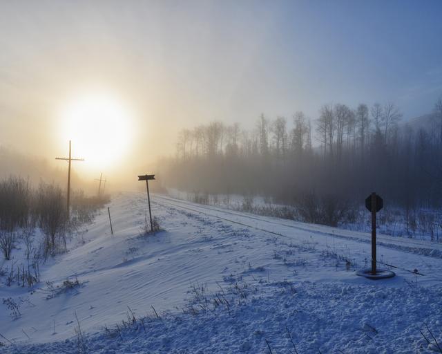 Keywords: fog train tracks winter transport railroad travel outdoor rural snow forest trees icy frozen sunrise canada