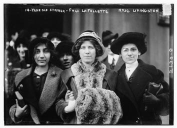 | Keywords: Fola La Follette, Rose Livingston and unidentified striker.jpg  en Photograph shows suffrage and labor activist Flora Dodge Fola La Follette 1882-1970 social reformer and missionary Rose Livingston and a young striker during a garment strike in New York City in 1913 Source Flickr Commons project 2011 1 negative glass 5 x 7 in or smaller LOC-image ggbain 12397 LC-DIG-ggbain-12397 http //loc gov/pictures/resource/ggbain 12397/ institution Library of Congress Prints Photographs Division D C 20540 USA http //hdl loc gov/loc pnp/pp print accession number Reproduction Number LC-DIG-ggbain-12397 digital file from original negative Call Number LC-B2- 2620-8 P P Title and date from data provided by the Bain News Service on the negative Forms part of George Grantham Bain Collection Library of Congress General information about the Bain Collection is available at http //hdl loc gov/loc pnp/pp ggbain Additional information about this photograph might be available through the Flickr Commons project at http //www flickr com/photos/library_of_congress/3065184717 undated Possibly 1913 garment workers' strike http //query nytimes com/gst/abstract html res 940DEEDE133BE633A25752C3A9679C946296D6CF Bain News Service Photographer unknown Rights Advisory No known restrictions on publication PD-Bain Strikes in the United States Labour movement in the United States Fola LaFollette Feminists from the United States Chinchilla clothing Muffs Black and white photographs of women Black and white photographs of groups New York City in the 1910s Women of the United States Strikes in the 1910s Strikes by textile workers Black and white photographs Garment workers Female trade unionists |