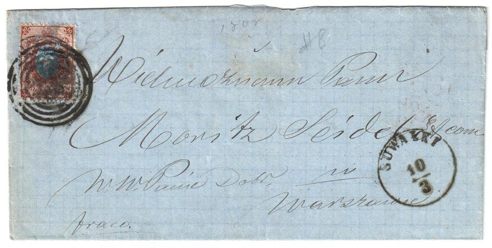 Keywords: Folded letter Suwalki to Warsaw 1868.jpg en 1866 10k brown and blue tied by four ring cancel with black Suwalki 13-3 departure cps late usage of Polish cancel since they were valid until 1864; replaced by Cyrillic thereafter used March 10 1868 on outer franco FL to Warsaw Arrival marking Warsaw 12-3 on back Catalogue Mi 21x 1868-03-10 own scan Post of the Russian Empire PD-RusEmpire other versions Covers of Russia 1868 Postal covers of Poland Scanned with HP LaserJet CM1410 Stamps of Russia on covers and postcards Definitive stamps of Russia Postmarks of Poland 1850-1919 1868 postmarks Stamps of Russia 1866 |