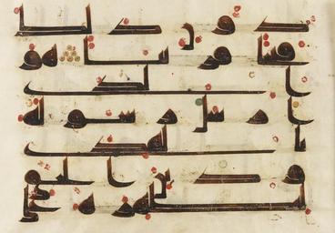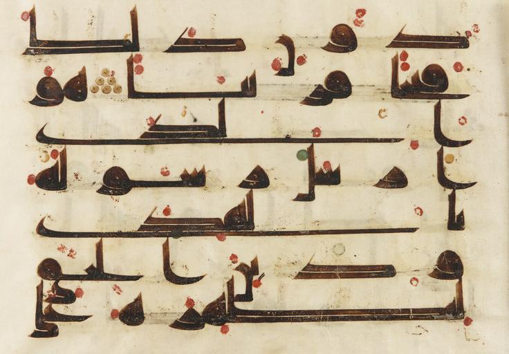 Keywords: Folio from a Koran (8th-9th century).jpg صحيفة من العصر العباسي فيها قسم من سورة الفتح «مِنْ دُونِ ذَلِكَ فَتْحًا قَرِيبًا هُوَ الَّذِي أَرْسَلَ رَسُولَهُ بِالْهُدَى وَدِينِ الْحَقِّ لِيُظْهِرَهُ عَلَى» Folio from a Koran Abbasid dynasty Near East or North Africa Ink and color on parchment 23 9 × 33 3 cm Part of Al-Fath Sura 48 verses 27-8 <div dir rtl> مِنْ دُونِ ذَلِكَ فَتْحًا قَرِيبًا هُوَ الَّذِي أَرْسَلَ رَسُولَهُ بِالْهُدَى وَدِينِ الْحَقِّ لِيُظْهِرَهُ عَلَى </div> and hath given you a near victory beforehand He it is Who hath sent His messenger with the guidance and the religion of truth that He may cause it to prevail over Pickthal's translation Une page du Coran dynastie Abbaside afrique du nord ou moyen orient Encres colorées sur parchemin 23 9 × 33 3 cm Sourate 9 Amnistie verset 33 C est lui qui a envoyé son Envoyé avec la guidance et la créance de vérité Traduction A Chouraqui http //www asia si edu/collections/zoom/F1930 62 jpg 8th-9th century Unknown in Abbasid dynasty PD-Old Assessment Assessments 5 2008 1 1 برگی از قرآن به خط کوفی 1 1 1 Folio from a Koran 8th-9th century jpg 1 2008 07 29 Qur'an manuscripts 8th-9th century Abbasid Qur'an Featured pictures on Wikipedia Arabic |