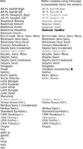 | Keywords: Fonts.svg Test which fonts are supported on Wikimedia sites List taken from m SVG fonts http //meta wikimedia org/w/index php title SVG_fonts oldid 577774 as of May 5 2007 Left Text as simple text Right Text converted to paths using Inkscape - not all fonts were available to me locally so I left those blank 2006-05-25 own assumed Dapete Font comparisons Files by User Dapete |