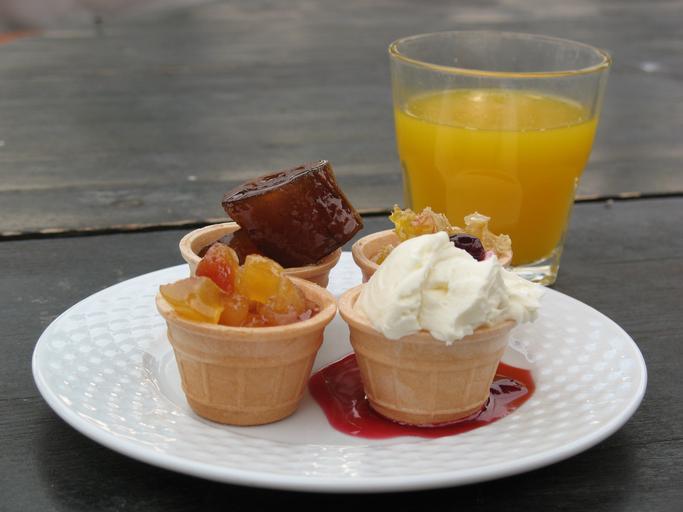 Keywords: food plate dish delicious colorful table ice cream jam juice dessert sweet