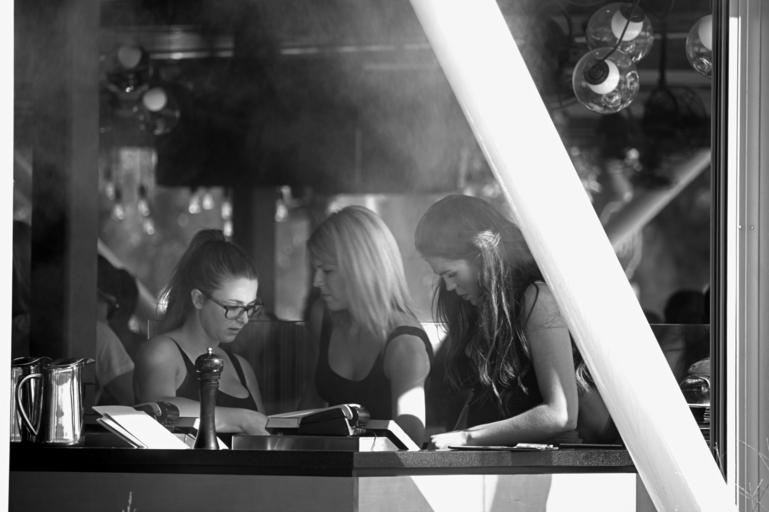 Keywords: blackandwhite black white bw monochrome street streetphotography downtown canada britishcolumbia bc okanagan kelowna women ladies girls females people shade contrasts mist summer