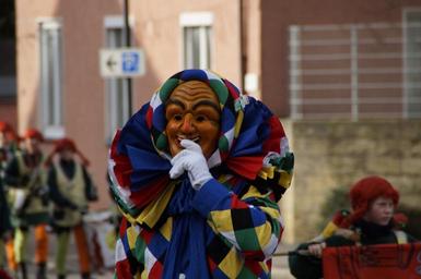 Keywords: fool clown fig funny harlequin costume swabian alemannic customs haestraeger carnival holzfigur masquerade fools jump panel strassenfasnet carved mask wooden mask tradition custom haes fasnet move fools guild guild group baden württemberg germany friendly winter drive