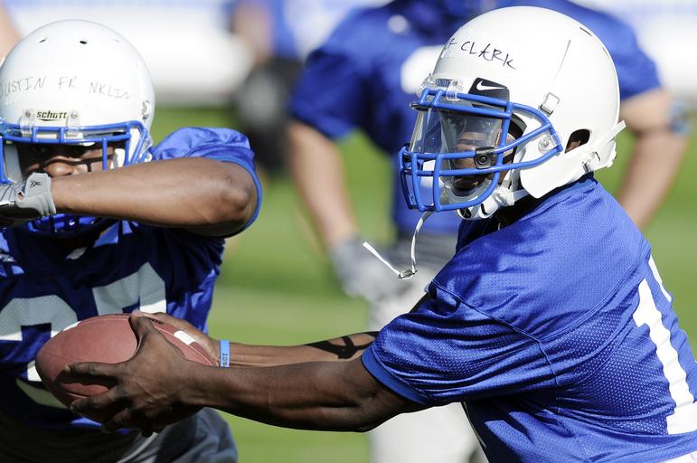 Keywords: football american college practice runner ball running back ball carrier quarterback handoff run stadium sport team players action