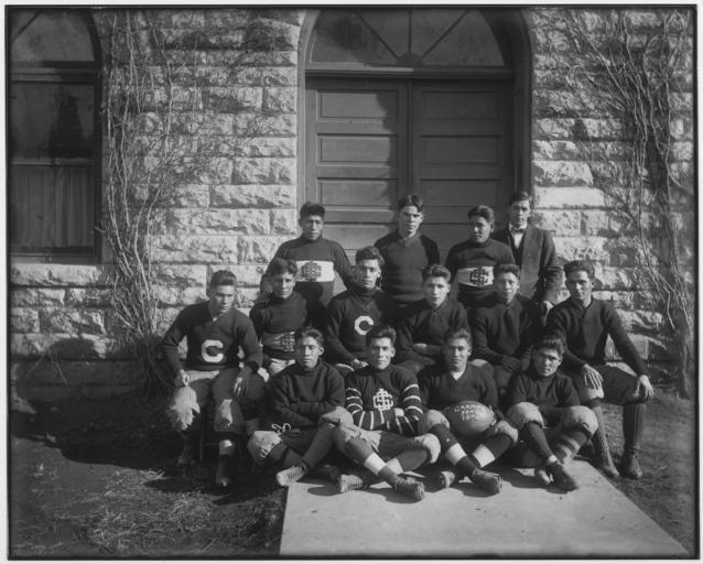 | Keywords: Football Team on Office Steps, 1915 - NARA - 251743.jpg Scope and content This photograph is part of a series of glass plate negatives used by the Chilocco Indian School print shop in publishing the Indian School Journal General notes 251743 Local identifier Department of the Interior Bureau of Indian Affairs Chilocco Indian School Office of the Special Disbursing Agent 1947 - ca 1952 NARA's Southwest Region Fort Worth NRFA 1400 John Burgess Drive Fort Worth TX 76140 1915 Record group Record Group 75 Records of the Bureau of Indian Affairs 1793 - 1999 Record group ARC 404 Glass Plate Negatives compiled 1909 - 1915 Series ARC 251710 File unit Glass Plate Negatives 1909 - 1915 File unit ARC 251711 Variant control numbers NAIL Control Number NRFF-75-47-GLASS-1 202 <br /> Other Identifier Box 1 Other versions <gallery> File Football_Team_on_Office_Steps _1915_-_NARA_-_251743 tif tif File Football_Team_on_Office_Steps _1915_-_NARA_-_251743 jpg jpg </gallery> NARA-cooperation PD-USGov Chilocco Indian Agricultural School Native American sports Group photographs of American football teams 1915 in American football |