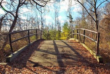 Keywords: outdoor serene trail park bridge on walking path in Toronto city park bridge on walking path in Toronto city park