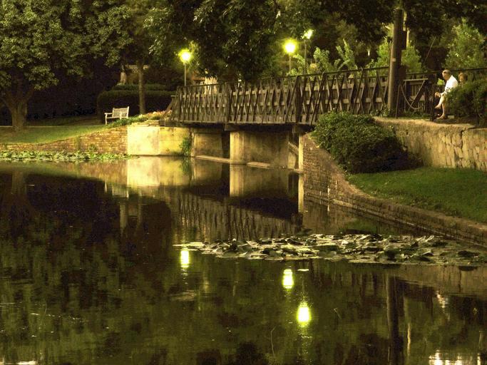 Keywords: footbridge night dusk stream creek water bridge lampposts bench twilight reflection urban