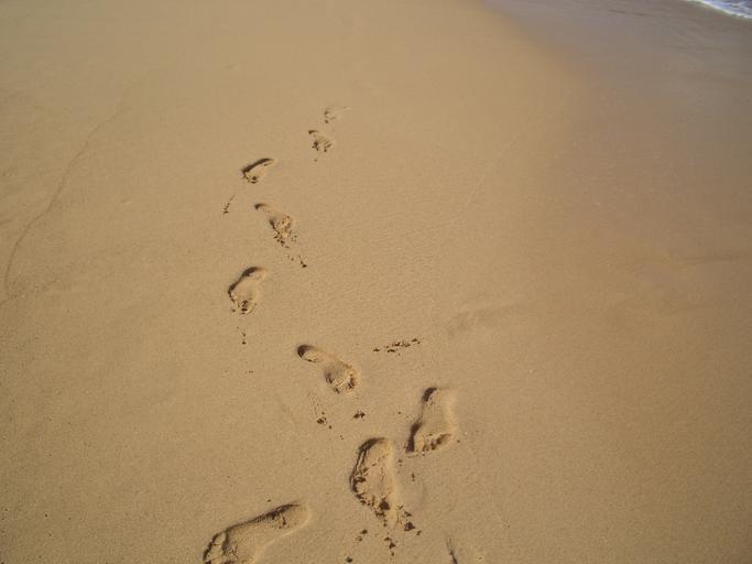 Keywords: footprints sand beach shoreline foot summer walk vacation travel coast footstep barefoot outdoor print coastline path journey track shore seaside trail seashore feet trace mark imprint step sandy shape ground way