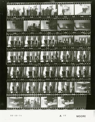 Keywords: Ford A0010 NLGRF photo contact sheet (1974-08-09)(Gerald Ford Library).jpg White House Photographic Office WHPO is housed at the Gerald R Ford Presidential Library a branch of the National Archives and Records Administration NARA <br/><br/> This file is a 200 dpi photo contact sheet having images from roll of film A0010 of the August 9 1974 - January 20 1977 Gerald R Ford White House Photographic Office Series A0001-A9999 and B0001-B2886 photographs <br/><br/> The date on the photo contact sheet is the date the roll of film was processed not necessarily the date the photographs were taken See table below for additional details 1974-08-09 Gerald R Ford Presidential Library Image http //www fordlibrarymuseum gov/library/whphotos/A0010_NLGRF jpg A0010_NLGRF jpg from http //www fordlibrarymuseum gov/library/whphotos/19740809whpo pdf White House Photographs August 9 1974 of the http //www fordlibrarymuseum gov/Library/whphotos/whpo asp White House Photographic Collection page White House Photographic Office WHPO - Moore PD-USGov Institution Institution Gerald R Ford Presidential Library Table wikitable sortable + Photo contact sheet A0010 U S President Ford Administration Gerald R Ford Library Frame s Tone Subject proper Subject generic Names Geographic Location Photographer Date - 1A-3A BW Reception Following Swearing in of Gerald R Ford as the 38th President of the United States handshaking GRF Betty Ford Guests White House Moore 1974-08-09 - 4A-5A BW Marine Military Aide Sardo walking GRF staff Rick Sardo 3rd Colonnade Moore 1974-08-09 - 6A-10A BW Following Swearing in of Gerald R Ford as the 38th President of the United States sitting alone in empty room GRF Roosevelt Room Moore 1974-08-09 - 11A-13A BW First Family - Following Swearing in of Gerald R Ford as the 38th President of the United States close up GRF Betty Ford Jack Steve Susan Michael Gayle Oval Office Moore 1974-08-09 - 14A-15A BW First Family - Following Swearing in of Gerald R Ford as the 38th President of the United States long shot GRF Betty Ford Jack Steve Susan Michael Gayle Oval Office Moore 1974-08-09 - 16A-18A BW First Family - Following Swearing in of Gerald R Ford as the 38th President of the United States; Family Housekeeper close up GRF Betty Ford Jack Steve Susan Michael Gayle Clara Powell Oval Office Moore 1974-08-09 - 19A-21A BW Half-brother and sister-in-law of Gerald R Ford -Following Swearing in of Gerald R Ford as the 38th President of the United States close up GRF Betty Ford Tom Ford Janet Ford Oval Office Moore 1974-08-09 - 22A-24A BW Following Swearing in of Gerald R Ford as the 38th President of the United States close up GRF Betty Ford Mr Mrs Leon Parma Oval Office Moore 1974-08-09 - 25A-28A BW Following Swearing in of Gerald R Ford as the 38th President of the United States close up GRF Betty Ford Unidentified couple Oval Office Moore 1974-08-09 - 29A-31A BW Following Swearing in of Gerald R Ford as the 38th President of the United States close up GRF Betty Ford Oval Office Moore 1974-08-09 - 32A-34A BW talking - Following Swearing in of Gerald R Ford as the 38th President of the United States close up GRF Betty Ford Michael Ford Oval Office Moore 1974-08-09 Gerald R Ford Presidential Library and Museum-cooperation PD-USGov Contact sheets by the Ford White House August 1974 |