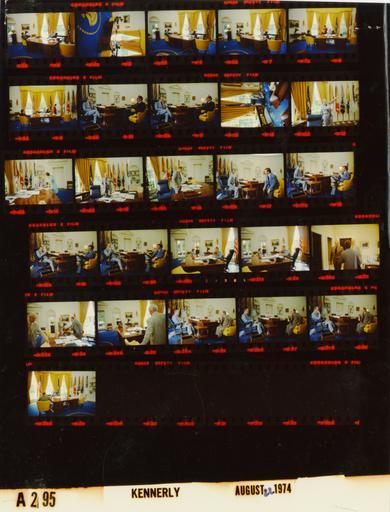 | Keywords: Ford A0295 NLGRF photo contact sheet (1974-08-22)(Gerald Ford Library).jpg White House Photographic Office WHPO is housed at the Gerald R Ford Presidential Library a branch of the National Archives and Records Administration NARA <br/><br/> This file is a 200 dpi photo contact sheet having images from roll of film A0295 of the August 9 1974 - January 20 1977 Gerald R Ford White House Photographic Office Series A0001-A9999 and B0001-B2886 photographs <br/><br/> The date on the photo contact sheet is the date the roll of film was processed not necessarily the date the photographs were taken See table below for additional details 1974-08-22 Gerald R Ford Presidential Library Image http //www fordlibrarymuseum gov/library/whphotos/A0295_NLGRF jpg A0295_NLGRF jpg from http //www fordlibrarymuseum gov/library/whphotos/19740822whpo pdf White House Photographs August 22 1974 of the http //www fordlibrarymuseum gov/Library/whphotos/whpo asp White House Photographic Collection page White House Photographic Office WHPO <br/> Creator David Hume Kennerly PD-USGov Institution Institution Gerald R Ford Presidential Library Table wikitable sortable + Photo contact sheet A0295 U S President Ford Administration Gerald R Ford Library Frame s Tone Subject proper Subject generic Names Geographic Location Photographer Date - 12 Color President's coat sitting on chair Oval Office Kennerly 1974-08-22 - 4-11 Color seated around desk GRF Kissinger Oval Office Kennerly 1974-08-22 - 13 Color standing putting on suit coat GRF Oval Office Kennerly 1974-08-22 - 14 Color Personal Secretary of the President Standing leaning on desk GRF Dorothy Downtown Oval Office Kennerly 1974-08-22 - 15-16 Color standing looking at desk GRF Oval Office Kennerly 1974-08-22 - 17-22 Color talking seated around desk GRF terHorst Oval Office Kennerly 1974-08-22 - 23 Color Attorney General standing greeting terHorst Buchen Saxbe Scheduling and Advance Office Kennerly 1974-08-22 - 24-25 Color Attorney General standing greeting GRF Buchen Saxbe Oval Office Kennerly 1974-08-22 - 26-29 Color Attorney General seated around desk GRF Buchen Saxbe Oval Office Kennerly 1974-08-22 Gerald R Ford Presidential Library and Museum-cooperation PD-USGov Contact sheets by the Ford White House August 1974 Photographs by David Hume Kennerly from 1974 |