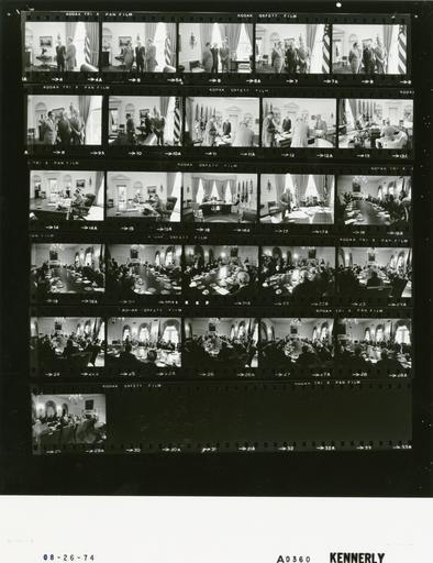Keywords: Ford A0360 NLGRF photo contact sheet (1974-08-26)(Gerald Ford Library).jpg White House Photographic Office WHPO is housed at the Gerald R Ford Presidential Library a branch of the National Archives and Records Administration NARA <br/><br/> This file is a 200 dpi photo contact sheet having images from roll of film A0360 of the August 9 1974 - January 20 1977 Gerald R Ford White House Photographic Office Series A0001-A9999 and B0001-B2886 photographs <br/><br/> The date on the photo contact sheet is the date the roll of film was processed not necessarily the date the photographs were taken See table below for additional details 1974-08-26 Gerald R Ford Presidential Library Image http //www fordlibrarymuseum gov/library/whphotos/A0360_NLGRF jpg A0360_NLGRF jpg from http //www fordlibrarymuseum gov/library/whphotos/19740826whpo pdf White House Photographs August 26 1974 of the http //www fordlibrarymuseum gov/Library/whphotos/whpo asp White House Photographic Collection page White House Photographic Office WHPO <br/> Creator David Hume Kennerly PD-USGov Institution Institution Gerald R Ford Presidential Library Table wikitable sortable + Photo contact sheet A0360 U S President Ford Administration Gerald R Ford Library Frame s Tone Subject proper Subject generic Names Geographic Location Photographer Date - 4 BW United States Ambassador-designate to Cyprus standing talking GRF William R Crawford Jr Oval Office Kennerly 1974-08-26 - 5-10 BW United States Ambassador-designate to Cyprus standing talking GRF William R Crawford Jr Kissinger Oval Office Kennerly 1974-08-26 - 11-13 BW Economic Advisors standing talking GRF Hartmann Siedman Rush Oval Office Kennerly 1974-08-26 - 14-15 BW Economic Advisors seated talking GRF Siedman Oval Office Kennerly 1974-08-26 - 16 BW Economic Advisors seated talking GRF Siedman Rush Oval Office Kennerly 1974-08-26 - 17 BW Executive Director Conference on Inflation GRF seated Sideman standing GRF Siedman Oval Office Kennerly 1974-08-26 - 18-29 BW Cabinet Meeting seated around table - all not in every frame GRF Rockefeller Secs Kissinger Schlesinger Simon Saxbe Morton Butz Dent Brennan Weinberger Lynn Brinegar; Ash Armstrong Burch Rush Marsh Hartmann Scali Greenspan Seidman Cabinet Room Kennerly 1974-08-26 Gerald R Ford Presidential Library and Museum-cooperation PD-USGov Contact sheets by the Ford White House August 1974 Photographs by David Hume Kennerly from 1974 Conference on Inflation 1974